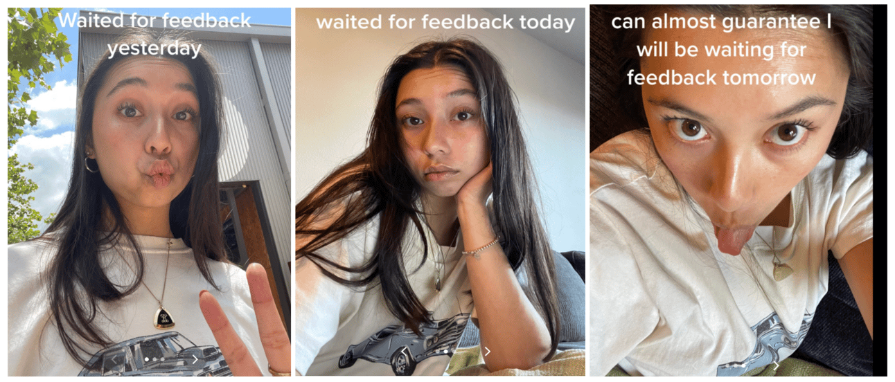 Here’s a slideshow TikTok I used when I was in my intern era: POV waiting for feedback. Who doesn’t just love a good TikTok?