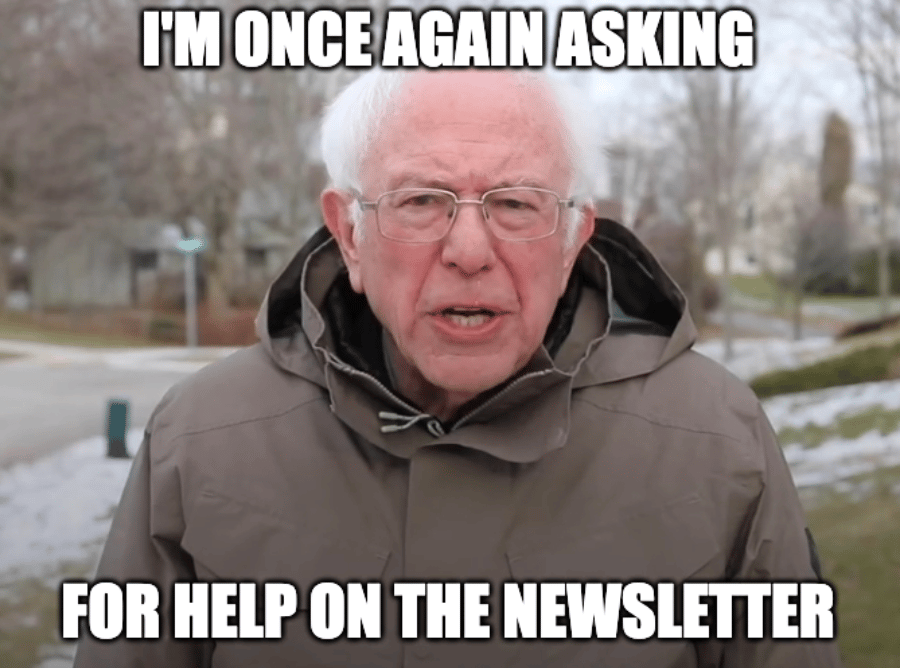 The Bernie meme — no explanation necessary tbh. Just find the image in imgflip, and let em know what you’re (once again) asking for.