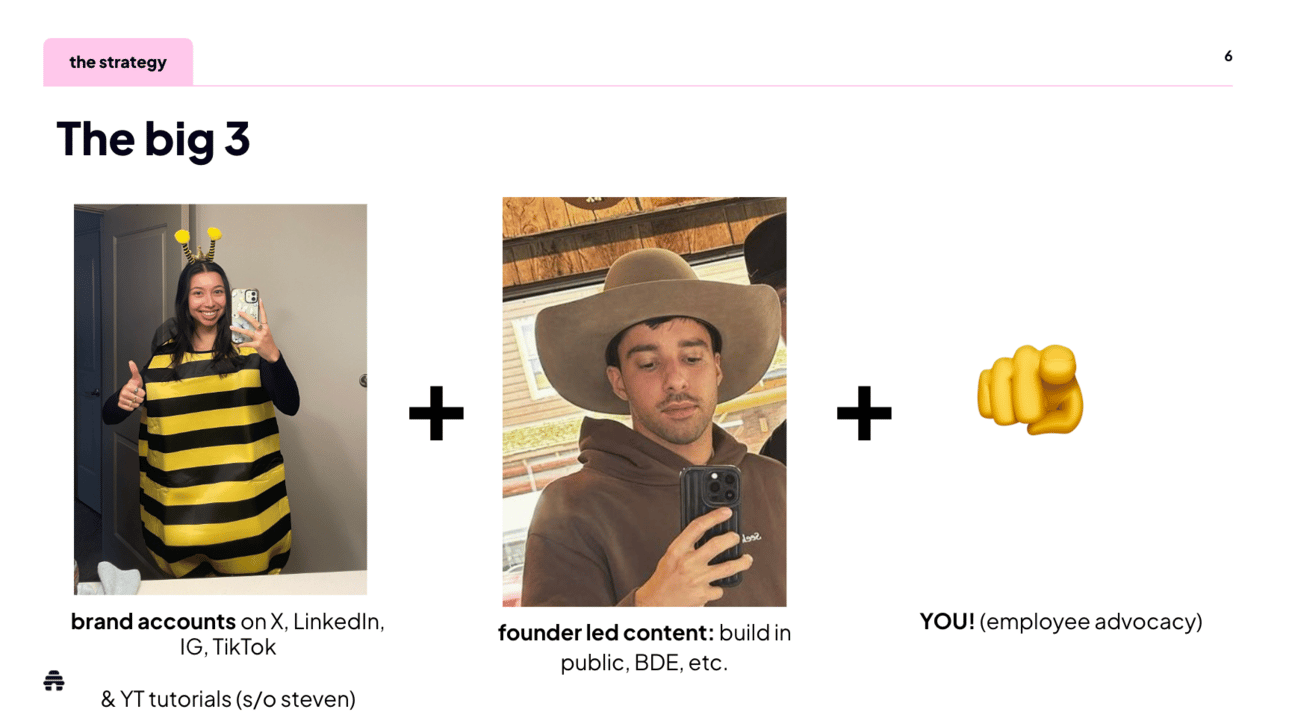 It’s where I give them a fun presentation on our social media strategy, why organic social is important, and how beehiiv (as a brand) shows up online.